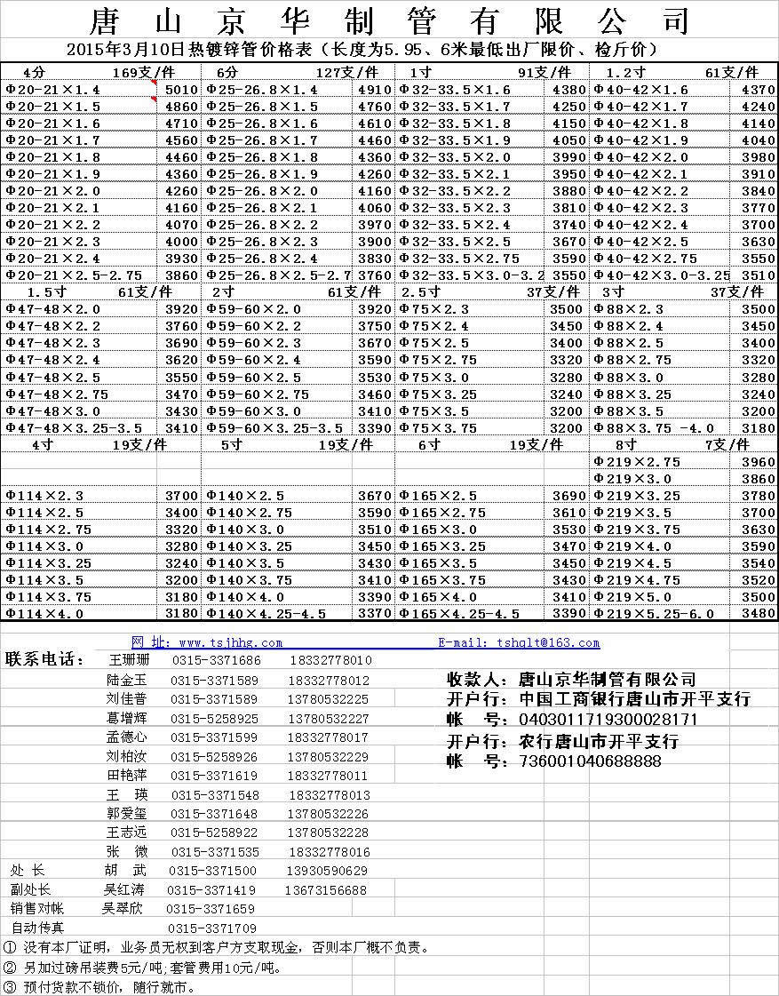 唐山京华2015年3月10日热镀锌管价格表(长度为5.95、6米最低出厂限价、检斤价)