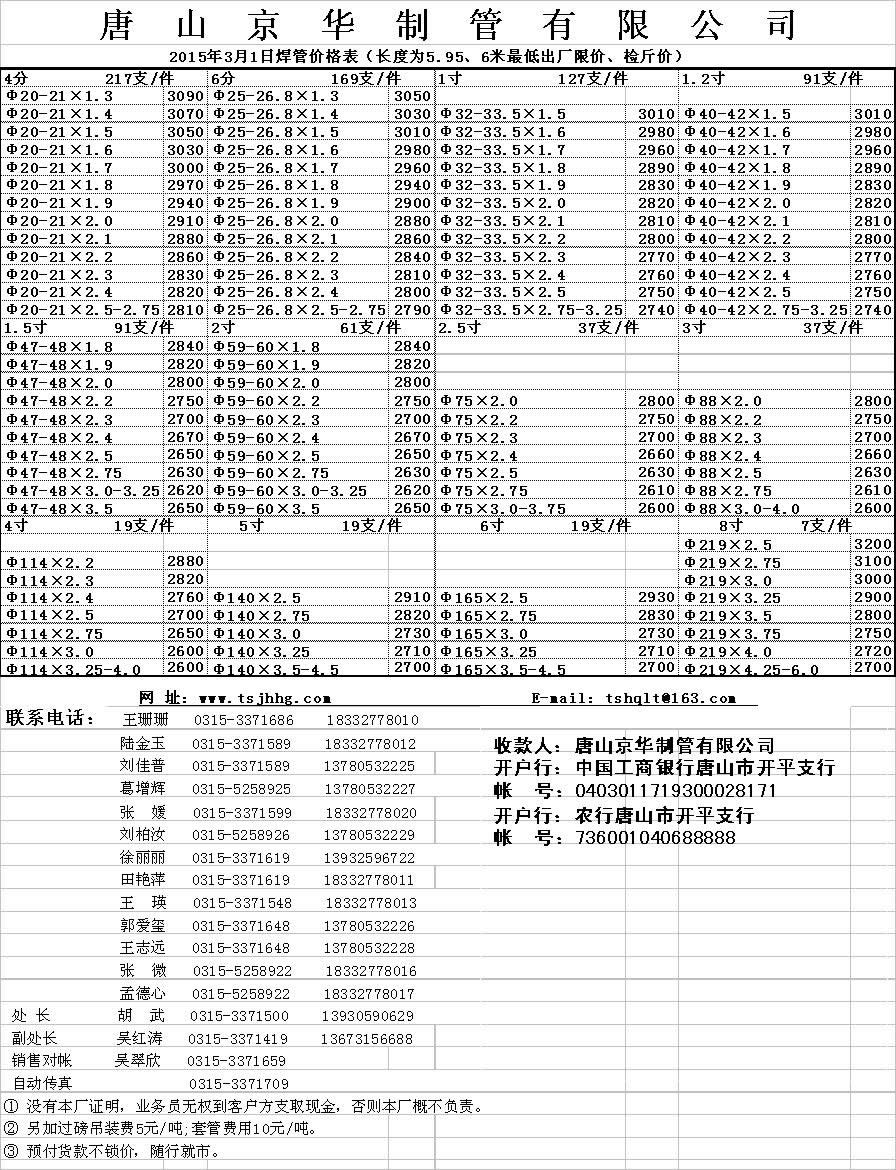 唐山京华2015年3月1日焊管价格表(长度为5.95、6米最低出厂限价、检斤价)